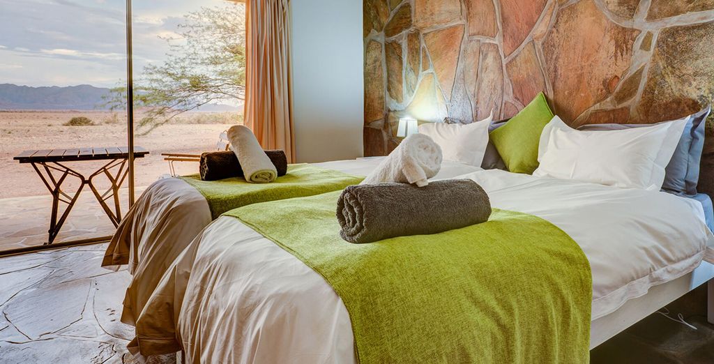 Le plus :Des chambres couleurs locales avec des matières naturelles et des meubles réalisés par des artisans locaux pour une parfaite immersion namibienne.