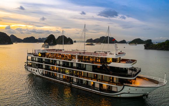 - Naviguer à bord d’une élégante croisière 5* au cœur de la spectaculaire baie d’Halong, classée au patrimoine mondial de l’UNESCO